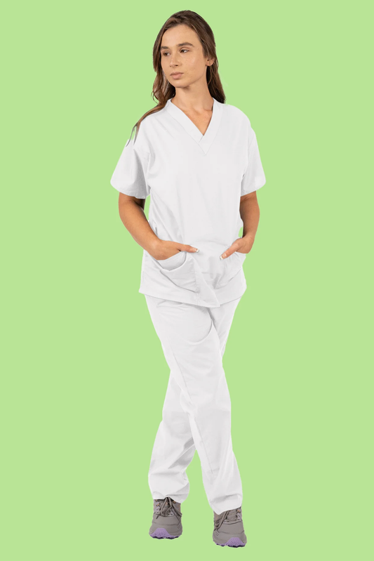 Ensemble médical Pepino pour femmes et hommes (unisexe) – Haut 3 poches à col en V et pantalon droit à taille élastique avec cordon de serrage et poche cargo – Blanc
