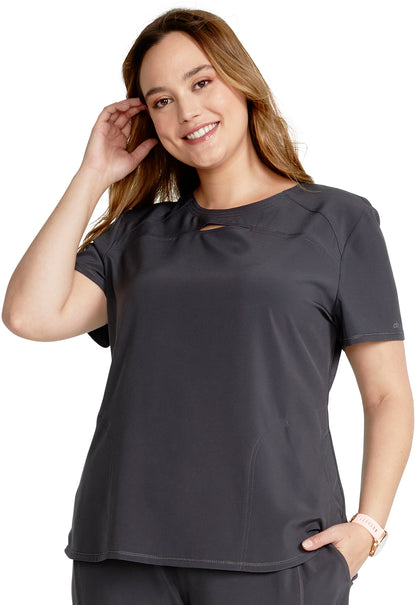 This Contemporary fit round neck top has multi-needle stitching at the front neckline, front yoke seams and a front chest seam with a peekaboo cutout. There are three pockets: two front pockets, one back zip pocket. Other features include front stylized darts, back princess seams and a shirttail hem. Center back length: 25"