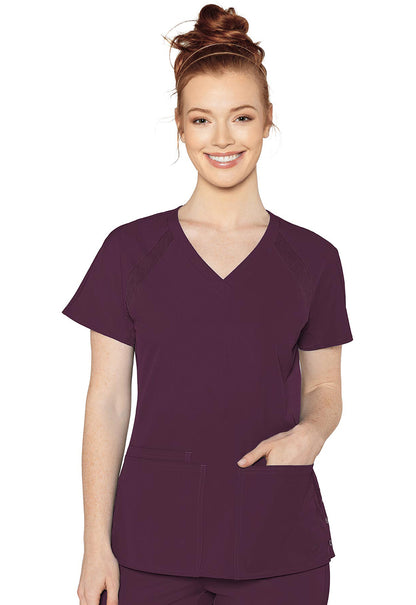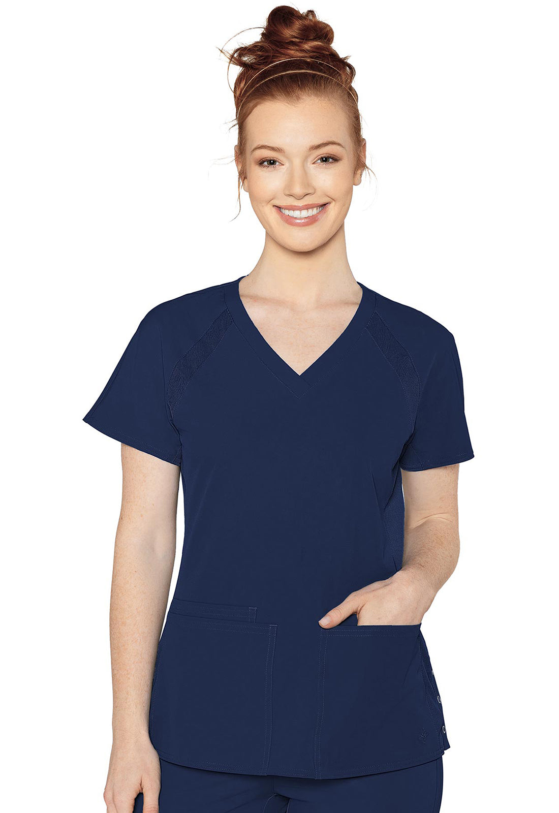 This item is final sale!Fashion and function are one. From the classic V-neck and rib-knit jersey inlay to the spacious pockets and interesting snap details, the Peaches raglan scrub top is a study in form fabric fit, and refinement. V-neck collar, Two patch pockets, One accessory pocket, Insert rib-knit detail, Side snap embellishments, Peaches Sensation Fabric. Back Length: 26 1/2"