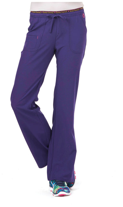 A Contemporary fit, low rise, flare leg pant has raised HeartSoul logo elastic all around waist, a functional drawstring and rounded patch pockets, including a small welt pocket with pink bar tacks. Also featured is an exterior pink bungee loop, a rounded back pocket for additional storage and side vents. Leg Opening 19". Inseam 30 1/2".