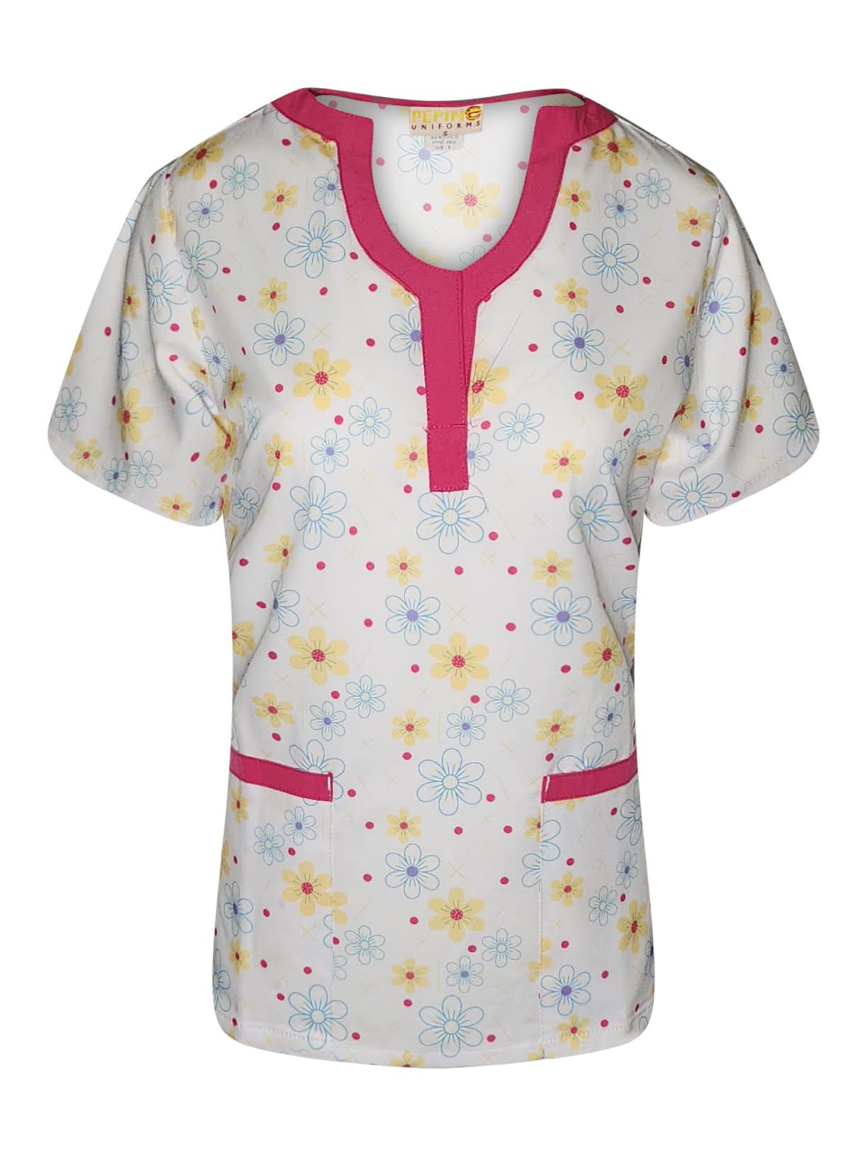 Pepino Uniforms Printed Pink Daisy Trim U-Neck Scrub Top