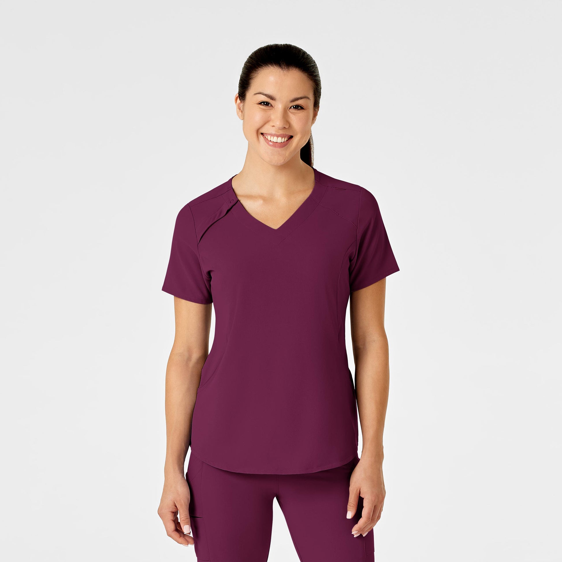 - Feature 1: Flattering curved V-neck with hidden zipper and shoulder badge loop