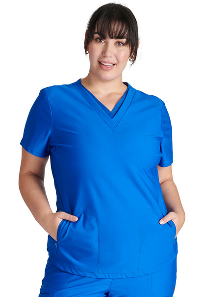 This Contemporary fit v-neck top has power mesh insets at the neckline for comfort and to make the garment easy to put on. Other features include front princess seams, two front zip pockets, and a curved hem with power mesh insets at the side seams for extra mobility. Center back length: 26".