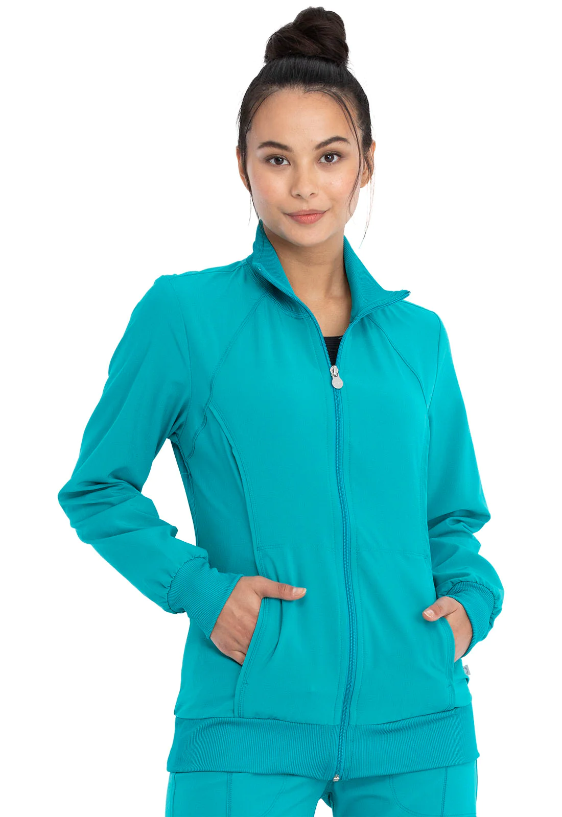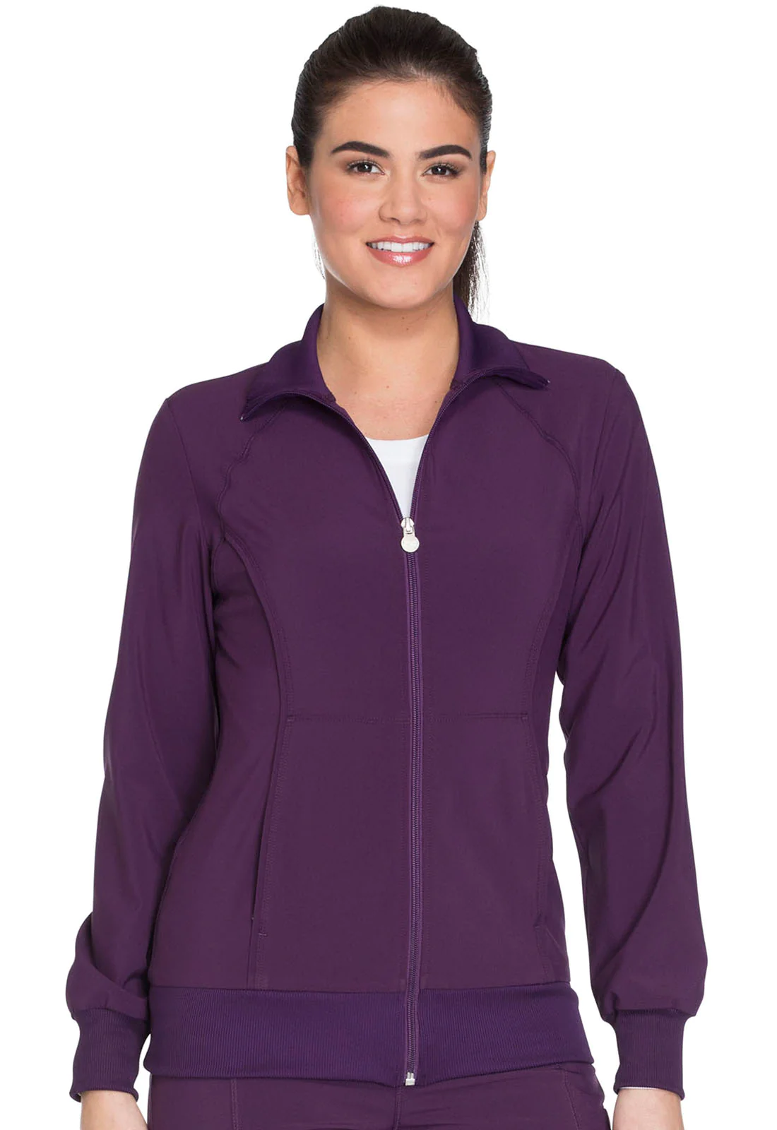 A Contemporary fit, sporty zip front jacket features front and back shoulder yokes, front princess seams with flat piping, hidden pockets with a zipper closure and a logo zipper pull. The back panel, collar, cuffs and waistband are made in a stretch rib knit for extra comfort. Coverstitch detail throughout. Center back length: 26". The comfortable stretch poplin fabric and super stretchy rib knit is the perfect combo for healthcare professionals.