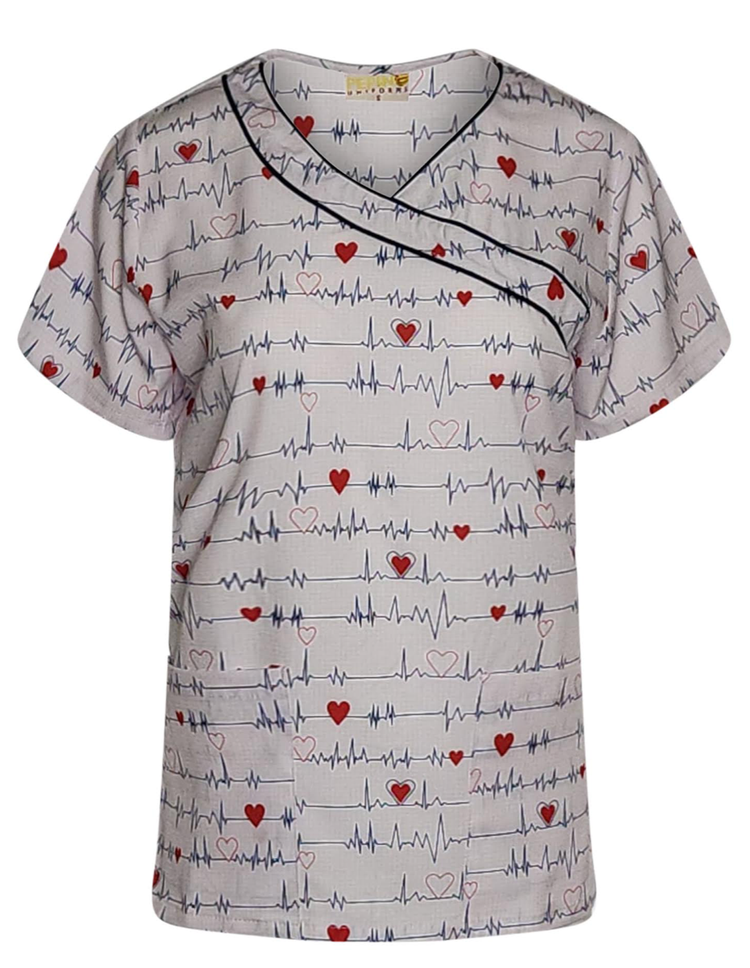 Pepino Uniforms Printed Navy EKG Mock Wrap Scrub Top